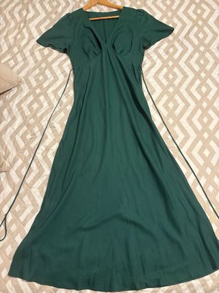 Vestido elegante de color verde, ideal para ocasiones especiales. Su diseño cruzado y con volantes le da un toque sofisticado. - Corte cruzado con cinturón. - Detalle de volantes en el bajo. - Mangas cortas tipo mariposa.