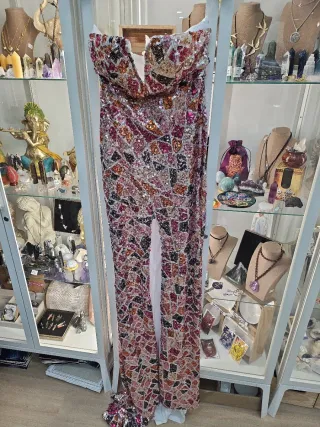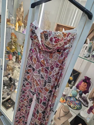 Elegante vestido de noche con un diseño deslumbrante de lentejuelas. - Diseño strapless. - Abertura frontal. - Lentejuelas en tonos dorados y rosados.