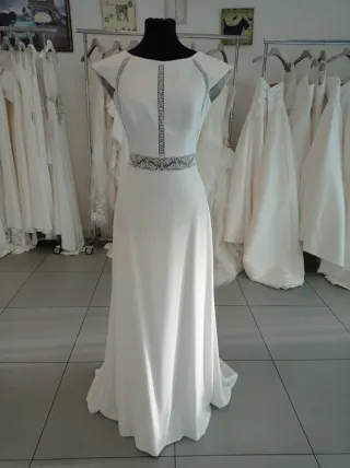 Somos tienda y estamos liquidando stock. Vestido Alba de la firma Novia D'Art. Pertenece a su colección atelier. Fabricado en crep mate y encaje. Precio original: 1750€ Es totalmente nuevo. Medidas Pecho: 96cm Cintura: 76cm Cadera: 106cm