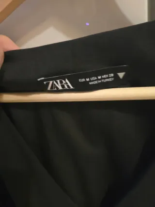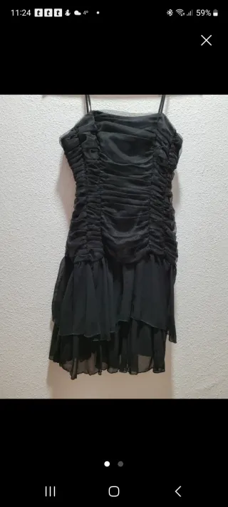 Talla XS (ver medidas en el carrusel de fotos) vestido negro ajustado de zara con escote pronunciado en forma de uve y flecos en ambas mangas (alguno de los flecos está algo deshilachado en el borde pero en general está en muy buenas condiciones, ver bien las fotos). Ideal cóctel o fiesta.