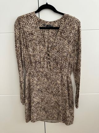 Vestido corto con estampado animal print. - Manga larga. - Escote en pico. - Cintura elástica.