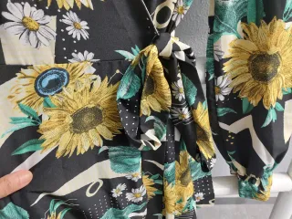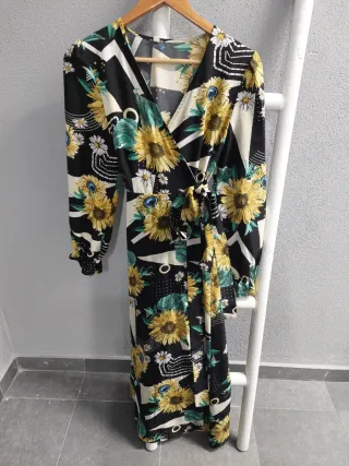 Vestido largo cruzado con un llamativo estampado de girasoles y detalles geométricos. - Diseño cruzado atado con lazada. Preciosa caída, tela suave Puesto un día. Vale para L - Mangas largas. - Estampado floral y geométrico.