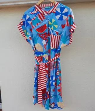 Vestido de la marca Lolina con un divertido estampado veraniego. - Diseño multicolor con motivos de playa. - Cuello camisero. - Cinturón a juego.