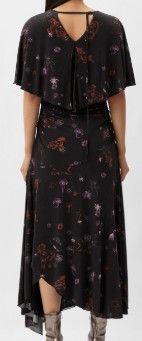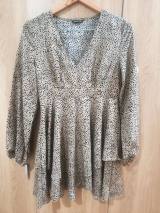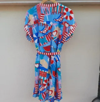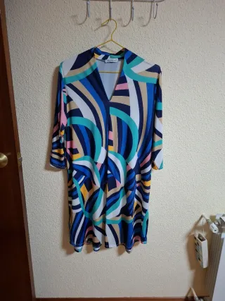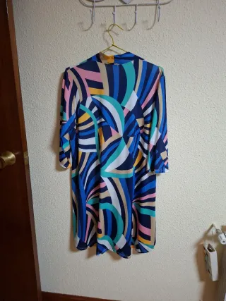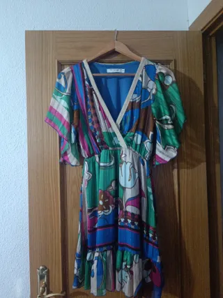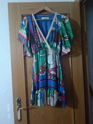 Vestido con un llamativo estampado. - Diseño cruzado en la parte delantera. - Mangas cortas tipo mariposa. - Cintura elástica. - Volante en el bajo. Aunque dice talla 44 es si te gusta la ropa olgada ,una S o una. M.en el cuello el borde de la V es dorado
