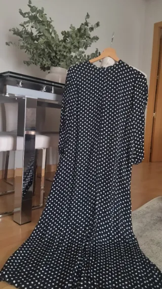 Vestido largo de Zara con estampado de lunares blancos sobre fondo negro. Tejido ligero, cremallera en la espalda y manga tres cuartos. Muy de actualidad los lunares ésta temporada. Perfecto estado.