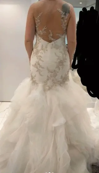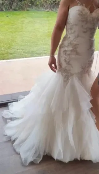 Elegante vestido de novia estilo sirena. El corpiño está adornado con detalles de pedrería y encaje. - Diseño de corte sirena. - Corpiño con pedrería y encaje. - Falda voluminosa con volantes de tul.
