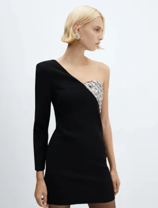 Vestido de fiesta de Mango con un diseño asimétrico y detalles brillantes. - Diseño de un solo hombro. - Detalle de lentejuelas en la zona del escote. - Manga larga en un lado.