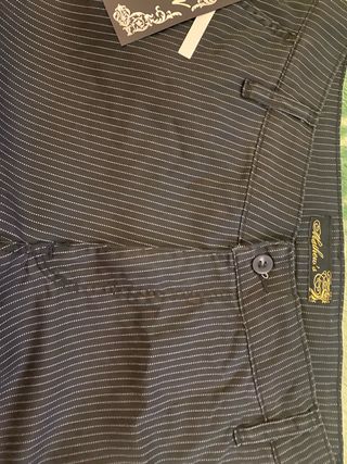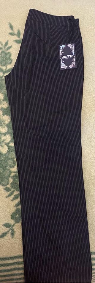 Pantalón de vestir con un diseño de rayas finas. - Diseño de rayas blancas sobre fondo negro. - Cierre de botón.
