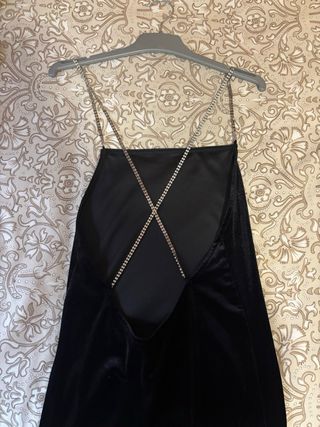 Elegante vestido negro de H&M, perfecto para eventos especiales. - Diseño largo y ajustado. - Tirantes con detalle de pedrería. - Tejido de terciopelo suave.