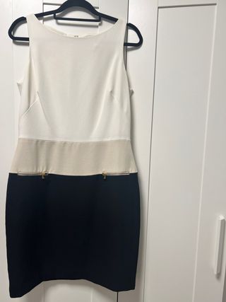 Vestido de corte recto con detalles modernos. - Diseño tricolor: blanco en la parte superior, beige en la cintura y negro en la falda. - Dos bolsillos frontales con cremallera dorada. - Sin mangas y con cuello redondo.