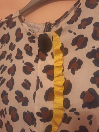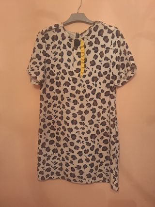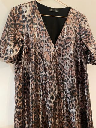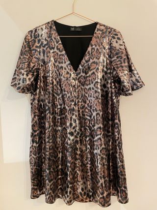Vestido corto de lentejuelas con estampado de leopardo. - Diseño con cuello en V. - Manga corta acampanada. - Acabado brillante. NO HAGO ENVIOS, centro de Madrid metro SOL o OPERA.