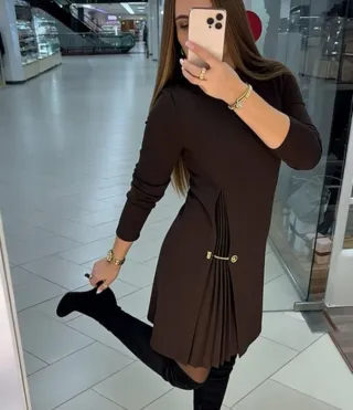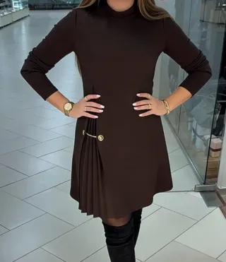 Vestido elegante de manga larga con un diseño moderno. - Detalle plisado asimétrico. - Cierre con detalle metálico dorado. - Cuello alto.