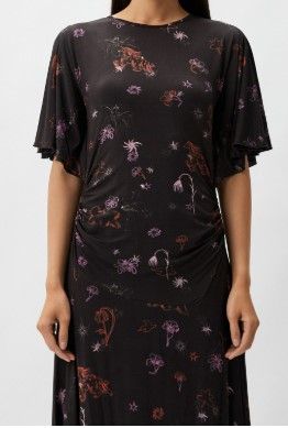 Elegante vestido de fiesta con un diseño moderno y sofisticado. - Tejido principal negro. - Detalle de transparencias en la parte superior. - Mangas largas. - Fruncido en la parte delantera para un ajuste favorecedor.