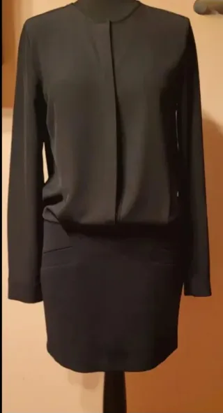 Vestido corto de Mango con un diseño elegante.Es original sin mangas y tiene dos tejidos diferentes el hombre y la falda.Sirve para verano o invierno.Usado solo una vez . - Escote en V. - Mangas cortas. - Cintura elástica. - Falda con textura.