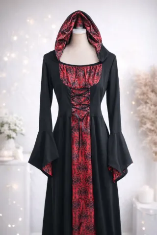Vestido largo con un diseño llamativo y detalles únicos. - Mangas acampanadas. - Capucha integrada. - Detalle de cordones en la parte delantera. - Panel central con estampado.