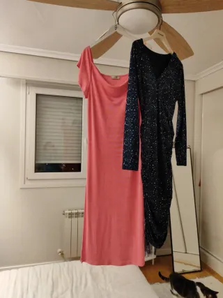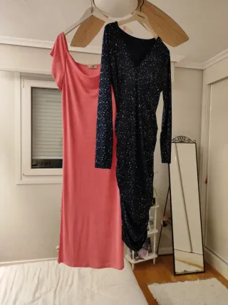 Conjunto de dos vestidos, uno largo de verano en color rosa y ajustado y otro de fiesta azul oscuro con puntos plateados y fruncido a los lados,disimula muy bien la tripita - Vestido de fiesta con manga larga y detalles brillantes. - Vestido de verano largo con tirantes finos.