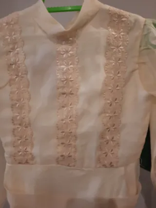 Vestido de comunión con detalles de encaje. - Diseño elegante con cuello alto. - Mangas largas con puños adornados. - Fajín ancho en la cintura. - Adornos florales en el frente y puños.