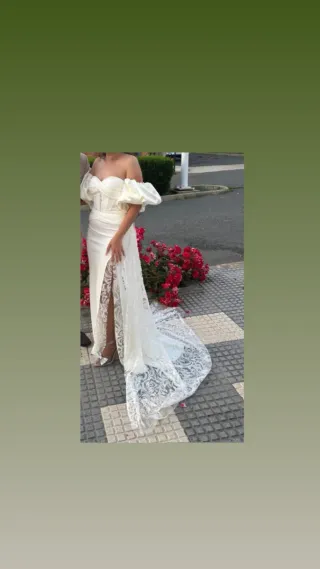 Elegante vestido de novia con un diseño sofisticado. - Cuerpo estilo corsé. - Mangas abullonadas. - Abertura lateral pronunciada. - Detalle de encaje en la falda y cola. Solo un rato puesto es muy bonito y fue echo a mano la cola las mangas la tela es de pedrería y es de Sara merino entra con abanico