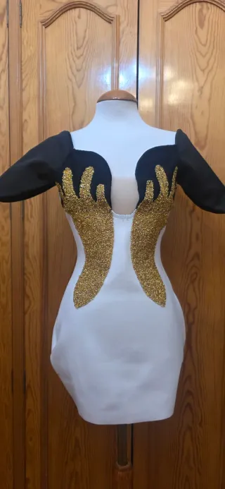 Vestido corto con un diseño llamativo y elegante. - Escote Bardot. - Detalle frontal con purpurina dorada. - Mangas cortas acampanadas.