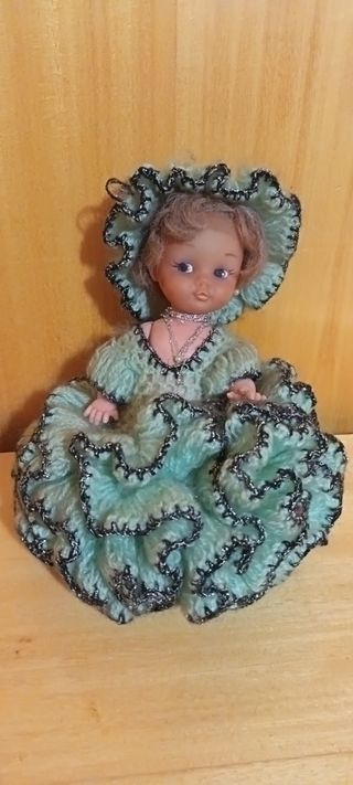 Preciosas muñecas de colección con un vestido de época detallado. - Vestido de hilo en color verde menta. - Adornos plateados en el vestido y el sombrero. - Collar plateado. - Expresión facial delicada.