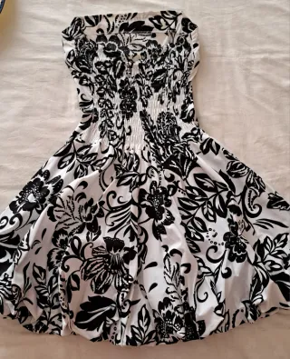Vestido corto con estampado floral en blanco y negro, con detalles plateados. Diseño palabra de honor. - Estampado floral. - Corte palabra de honor. - Corto con el bajo abullonado. - Usado una vez.