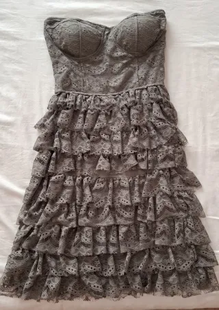 Vestido corto palabra de honor con volantes. - Tejido de encaje. - Cuerpo con copas. - Falda con volantes en cascada. - Usado una vez.
