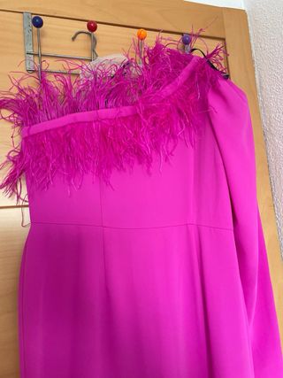 Vestido de fiesta de la marca Matilde Cano, ideal para ocasiones especiales. Conserva la etiqueta original. - Diseño elegante con detalles de plumas. - Manga larga. - Corte favorecedor.