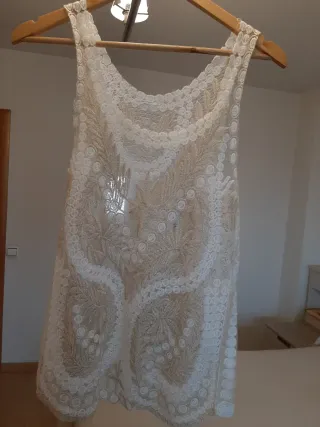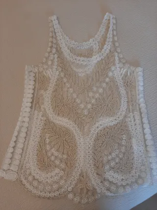Precioso top de vestir con un diseño delicado en encaje. - Elegante, lara ocasiones especiales - semi transparente - Bordefestoneado-Hilos dorados - Tirante -Usado solo una vez -En tienda me costó 80 euros