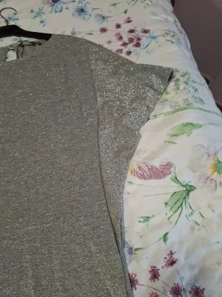 Vestido corto con un acabado brillante que capta la luz. - Diseño elegante y moderno. - Tejido con destellos plateados. Da poca talla.