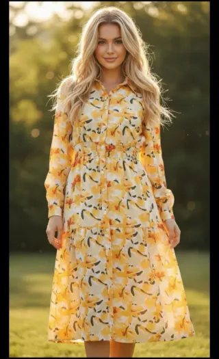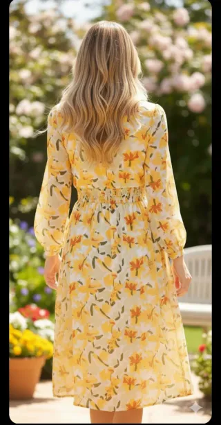 Precioso vestido con estampado floral en tonos amarillos. Ideal para cualquier ocasión. - Diseño abotonado. - Cintura elástica. - Falda con volantes.