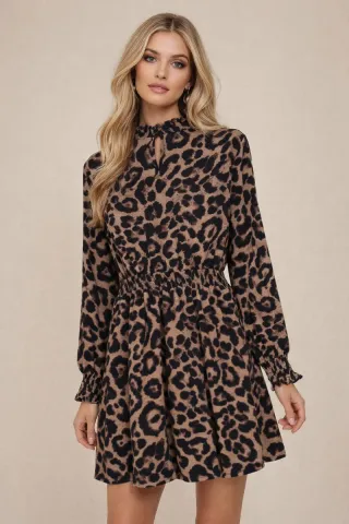 Vestido con un llamativo estampado de leopardo. Su diseño presenta un cuello alto con detalle de lágrima y mangas largas. - Estampado de leopardo. - Cuello alto con abertura. - Mangas largas abullonadas. - Cintura elástica.