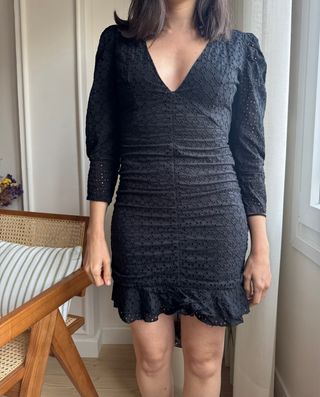 Vestido negro con un diseño elegante y favorecedor. - Tejido con detalles calados. - Mangas abullonadas. - Cintura drapeada. - Bajo con volante. - un uso