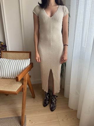 Vestido midi de Zara en canalé, perfecto para cualquier ocasión. - Diseño ajustado. - Escote en pico. - Abertura lateral en la falda.