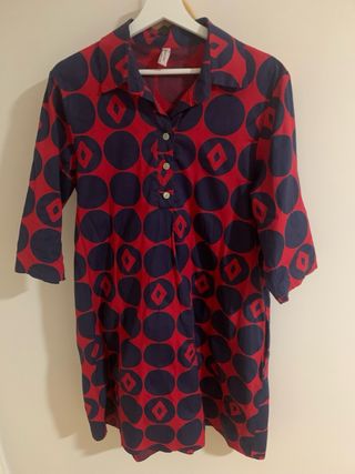 Vestido camisero con un llamativo estampado. - Diseño con círculos y rombos. - Cuello camisero. - Cierre de botones en la parte superior. - Manga tres cuartos. -bolsillos a los lados