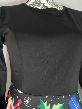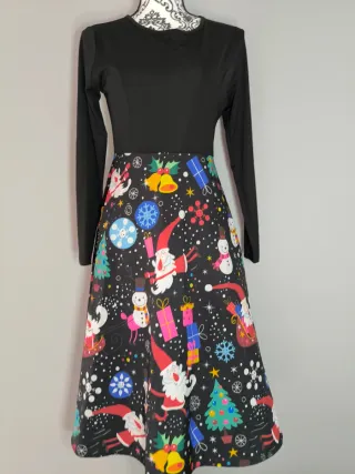 Vestido con estampado navideño divertido y colorido. - Diseño de manga larga. - Falda con estampado de Papá Noel, muñecos de nieve, árboles de Navidad y regalos. - Base negra con detalles festivos.