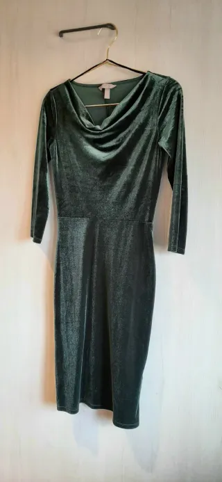 Elegante vestido de terciopelo con manga francesa y escote drapeado. Tiene un poco de elástico para un mejor ajuste, muy cómodo. Usado en una comida de Navidad