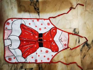 Este delantal tiene un diseño divertido y festivo, perfecto para la temporada navideña. - Diseño de vestido rojo con cinturón negro. - Estampado de copos de nieve. - Ribete rojo. - Lazos para atar.