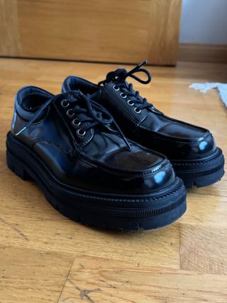 Elegantes zapatos de vestir con un diseño moderno y suela gruesa. Puestos un dia en una cena de navidad. - Acabado brillante. - Cierre con cordones. - Punta cuadrada.