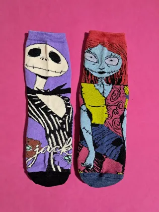 Pack de calcetines con diseños de Jack Skellington y Sally de Pesadilla antes de Navidad. - Diseño de Jack Skellington en morado. - Diseño de Sally con su característico vestido. - Talla única.