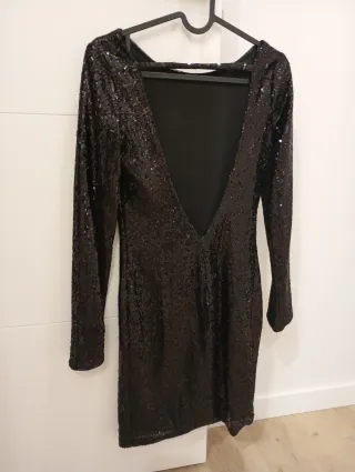 Vestido ideal para brillar en cualquier fiesta. Es un diseño corto, completamente cubierto de lentejuelas negras que reflejan la luz de forma preciosa. La espalda al aire le da un toque súper sexy y elegante sin exagerar. El tejido es cómodo, se adapta bien al cuerpo y realza la figura. Perfecto para Nochevieja, eventos, cumpleaños o cualquier plan donde quieras destacar ✨