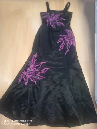 Vestido negro con escote palabra de honor y corte en A. Tela satinada. En la falda tiene un forro para darle algo más de vuelo. Cremallera en la parte traseta. Vestido muy favorecedor perfecto par nochevieja, reyes y graduaciones. Solo se ha utilizado en una ocasión. Era más largo pero tiene el bajo arreglado a la longitud que se ve en la foto.