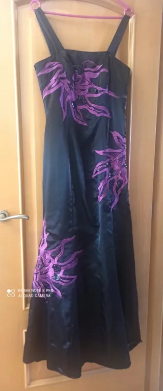 Elegante vestido largo de ceremonia. Presenta un diseño sofisticado con detalles bordados y corte sirena. - Un sólo uso. - De raso, doble forro. - Bordado ornamental en tono morado. - Medidas en las fotos. - Navidad, Nochevieja, coctel, boda, madrina, celebración, eventos...