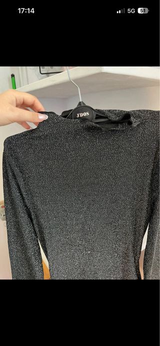 Vestido negro con un toque de purpurina. Hombros descubiertos y manga semi larga. Queda encima de las rodillas. ***SÓLO SE HA USADO EN UNA NOCHEVIEJA***