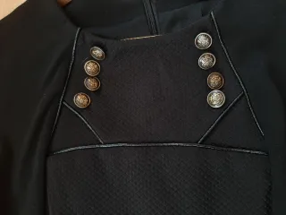 Vestido corto de manga larga con un diseño llamativo. Le faltan algunas tachuelas, de ahí el precio. - Escote redondo. Largo 85 cm - Adornado con tachuelas doradas en forma de abanico. - Largo hasta la rodilla.