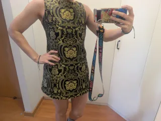Vestido de fiesta con un estampado llamativo. Talla 38 pequeña, para una 36 y pecho pequeño. - Diseño sin mangas. - Largo hasta el muslo. - Estampado barroco en negro y dorado. Fin de año, nochevieja