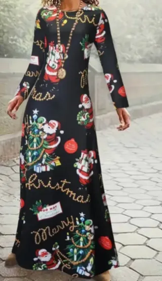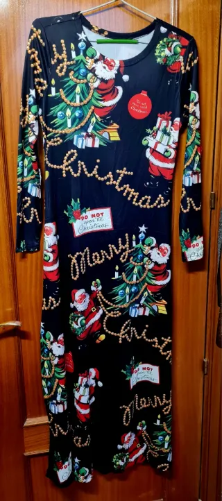 Vestido largo con estampado navideño. Presenta un diseño divertido y festivo con motivos de Santa Claus, árboles de Navidad y regalos. - Diseño de manga larga. - Largo hasta los tobillos. - Estampado integral con temática navideña. Sin estrenar. Para Nochebuena,Nochevieja, Navidad, Reyes, Disfraz, Fiestas ... Talla S/M ¤¤¤¤° Más cosas en mi perfil °¤¤¤¤
