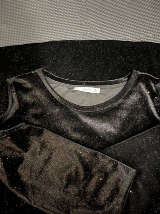 Vestido corto talla M de Mango, en color negro con estrellitas negras de terciopelo, manga corta, cuello redondo, diseño de dos capas en tejido vaporoso con forro interior de tela que no pega al cuerpo. Medidas: largo 85cm, ancho 90-1,20 cm. Lo he usado solo la navidad pasada. Está como nuevo, sin etiquetas, muy cómodo al ser flojito. Ideal nochevieja.