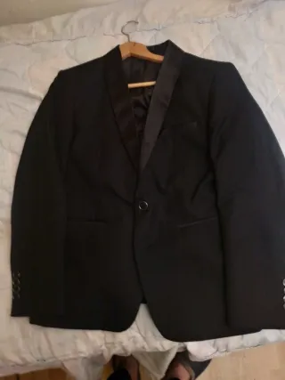 Conjunto de traje negro, ideal para eventos formales. - Chaqueta con solapa. - Pantalón de vestir a juego. - Camisa blanca Lo ha llevado mi hijo dos días, en dos nocheviejas. Con 17 y 18 años El usa una M y ya le está pequeño. Sería una S