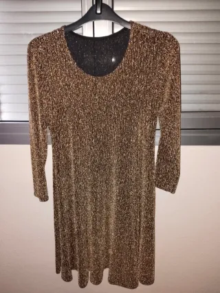 Vestido de fiesta con un llamativo acabado brillante. - Diseño de manga larga - Tejido bastante adaptable a cada cuerpo - No tiene forro: tela por fuera dorada y por dentro negra (el vestido no es reversible). Comprado en tienda de Centro Comercial. Puesto una o dos veces. Ideal para ocasiones especiales: Nochevieja, salir de fiesta, baile.