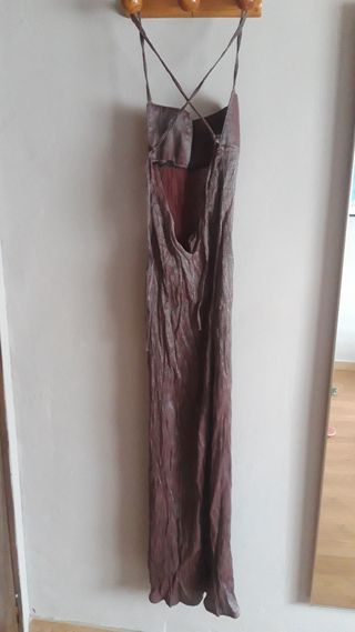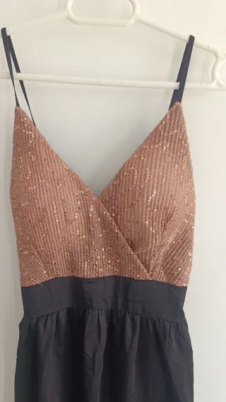 Vestido para ocasiones especiales como nochebuena, nochevieja o cenas de empresa. Es un vestido negro, sin mangas y con la falda de lentejuelas doradas rosada. La falda tiene forro interior. Lo he usado en una ocasión esta como nuevo.